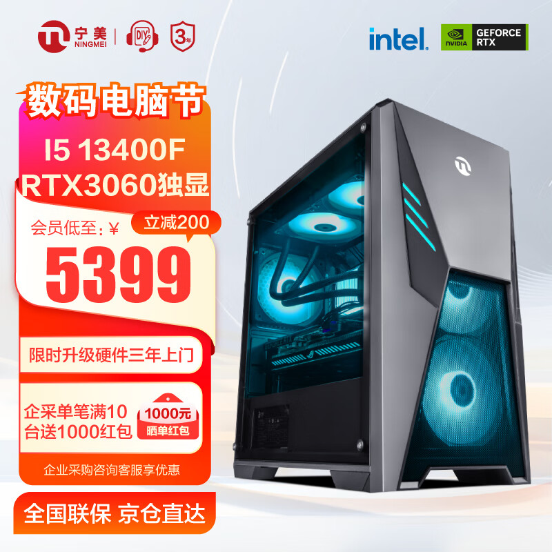 宁美国度魂 13代i5 13400F/RTX3060/16G内存/1T固态/吃鸡永劫无间游戏台式电脑主机/DIY组装电脑/UPC价格:5599.00元!
