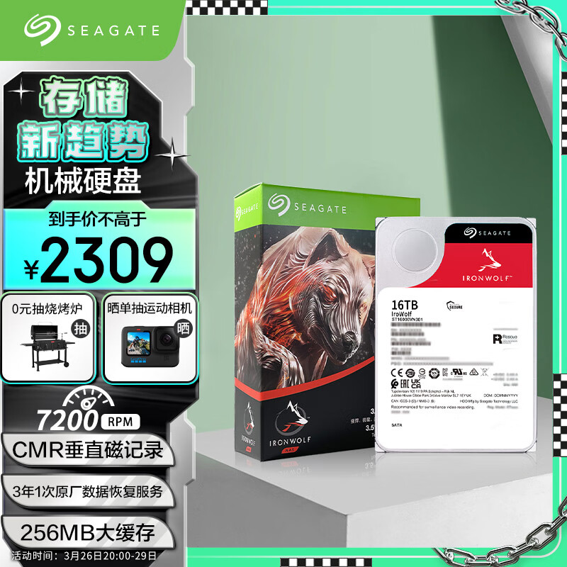 希捷(SEAGATE)NAS硬盘 16TB 256MB 7200转 CMR垂直 网络存储 SATA 希捷酷狼 机械硬盘 数据恢复服务 3.5英寸价格:2309.00元!