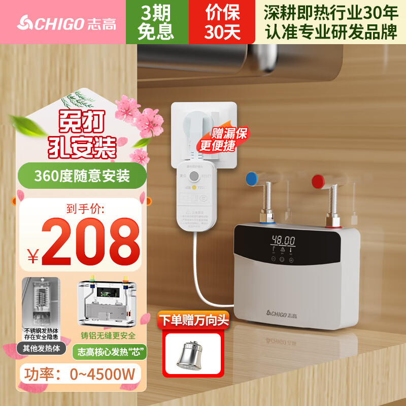志高即热式电热水器小厨宝4500W迷你家用电热水龙头加热器集成免储水不限水量过水热水宝KBR-F45价格:208.00元!