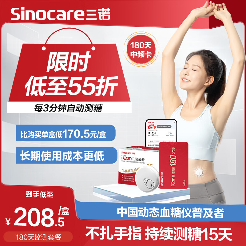 三诺(Sinocare)爱看动态血糖仪爱看自由180天中频卡 到手不低于12盒价格:2502.00元!