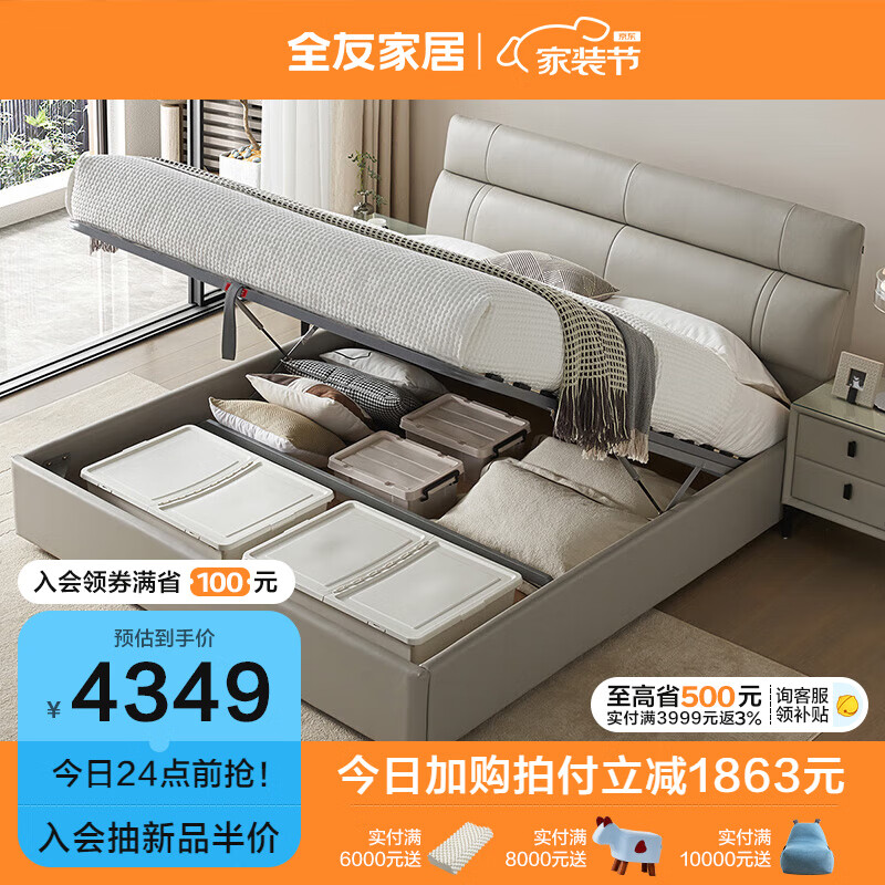 全友家居 真皮艺床头层牛皮现代简约主卧室双人大床高箱储物床105251价格:6212.86元!
