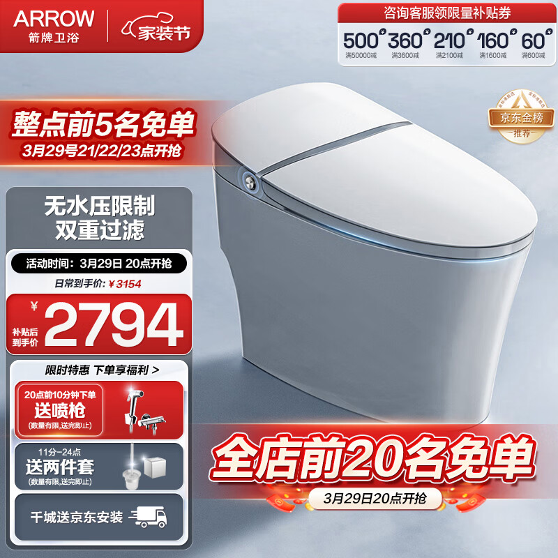 箭牌(ARROW)低水压限制智能马桶虹吸式电动一体机坐便器家用双水路AKE1138L价格:4179.00元!