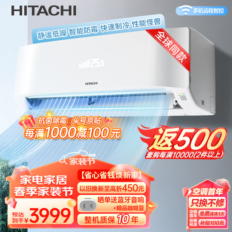 日立(HITACHI)白熊君新1级能效 1匹全直流变频空调挂机舒适节能低噪除湿除潮健康除菌以旧换新RAK/C-HH09PHAPC价格:4399.00元!
