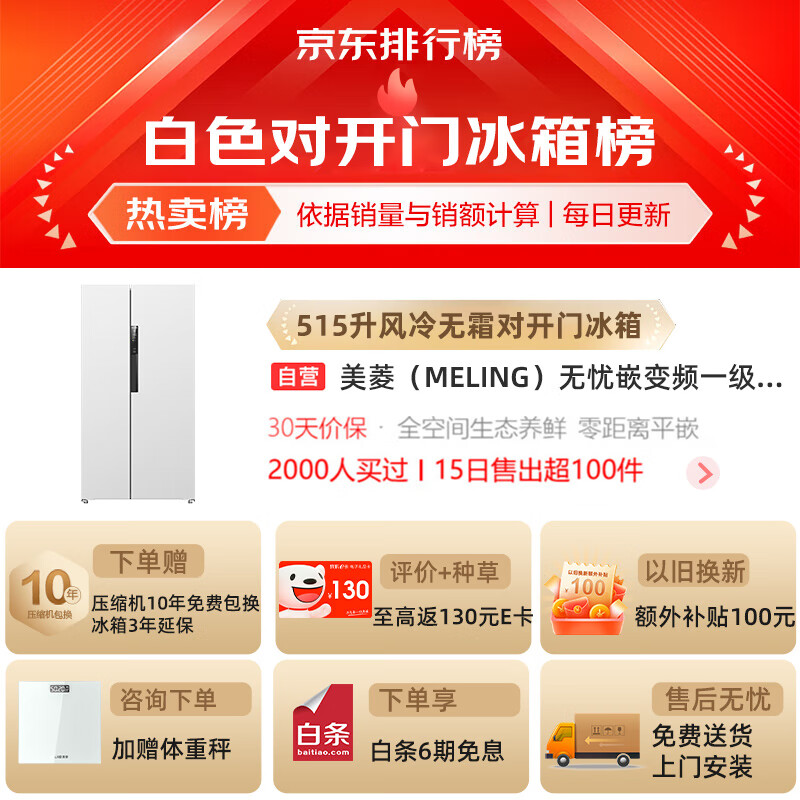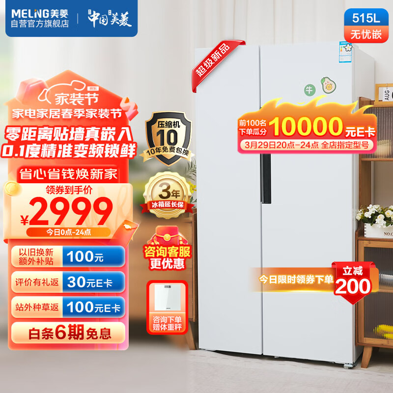 美菱(MeiLing)无忧嵌变频一级能效515升对开门双开门冰箱家用节能风冷无霜超薄可嵌入式大容量白色BCD-515WPCZX价格:3199.00元!