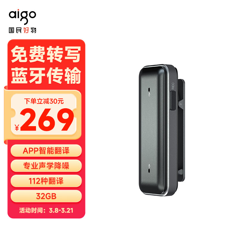 爱国者aigo SR20p智能Ai录音笔 专业高清降噪 会议录音转文字 录音器 同声传译 32G黑色价格:299.00元!