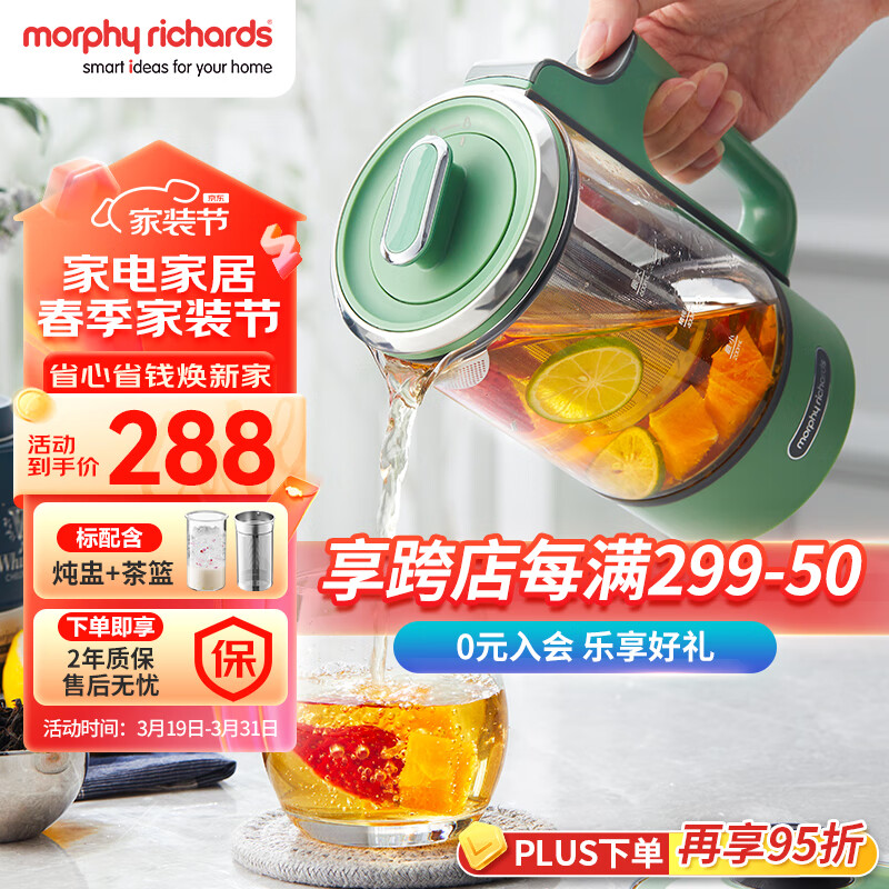 摩飞电器(Morphyrichards)养生壶 分体便携式迷你煮茶器 烧水壶 小型办公室家用 多功能煮茶壶分体式热水壶0.6L MR6085 绿价格:288.00元!