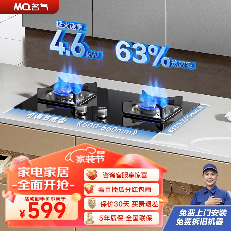名气(MQ)老板家用燃气灶天然气 嵌入式小尺寸 4.6KW大火力猛火灶 可调节底盘灶具 双灶煤气灶 JZT-A6312B价格:599.00元!