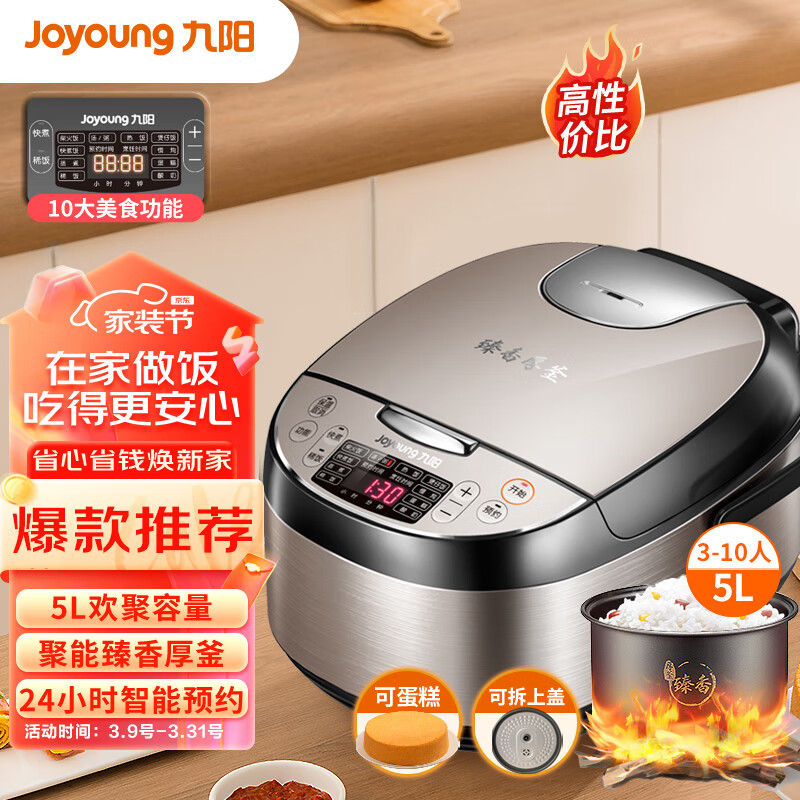 九阳(Joyoung)5升3~10人家用多功能电饭煲电饭锅金属机身臻香厚釜内胆智能控温防溢柴火饭不粘内胆5L饭煲F7130价格:198.90元!