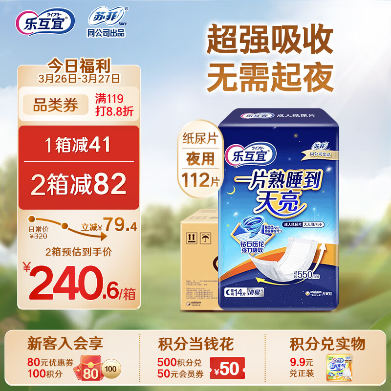 乐互宜夜用成人纸尿片护理产褥垫老年人孕妇安心垫夜用箱装112片价格:320.00元!