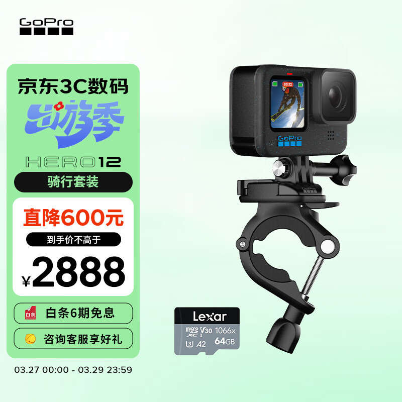 GoPro HERO12 Black运动相机 户外潜水滑雪防抖相机 防水vlog照相机 户外骑行套装【手把固定座+64G卡】价格:2888.00元!
