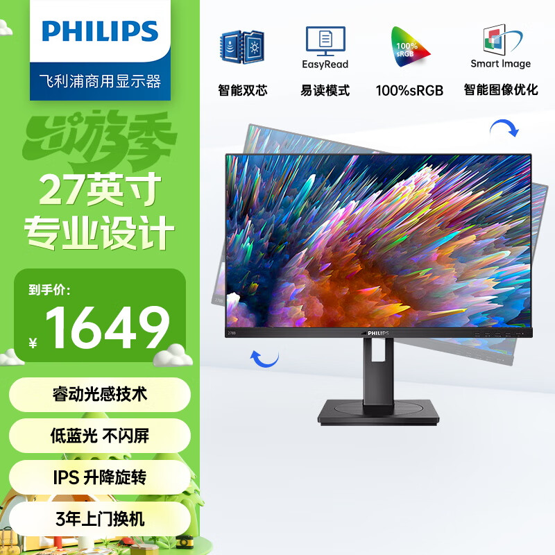 飞利浦(PHILIPS)27英寸 4K显示器 IPS 100%sRGB TUV滤蓝光认证 升降旋转 智能双芯 办公设计 电脑显示屏 278B1N价格:1649.00元!