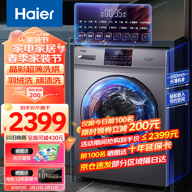 海尔全自动洗衣机洗烘一体机变频滚筒洗衣机家用10KG公斤大容量一级能效晶彩屏羽绒洗价格:2599.00元!
