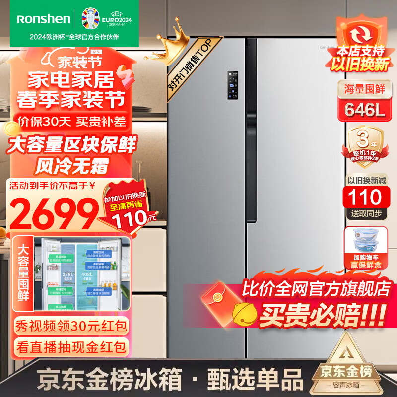 容声(Ronshen)646升对开门一级能效风冷无霜型家用变频双门二门超大容量可嵌入式双开门两开门电冰箱 BCD-646WD11HPA价格:2899.00元!