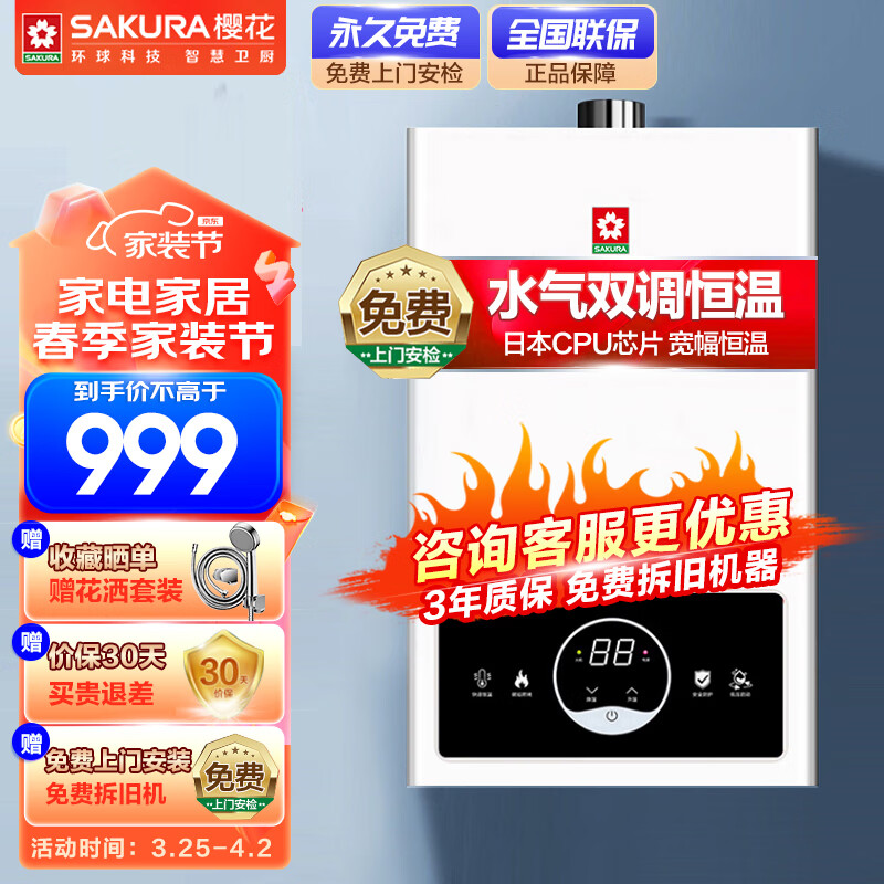 樱花(SAKURA)燃气热水器天然气13升 水气双调 日本CPU 智能精控恒温 低压启动 多重安防 家用 JSQ25-JJP002价格:999.00元!