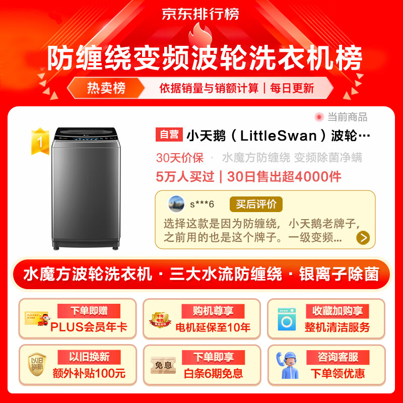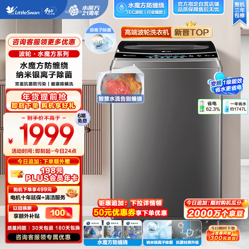 小天鹅(LittleSwan)波轮洗衣机全自动 水魔方系列 【TB100TEC】 变频防缠绕 健康除菌螨 直驱 以旧换新 10公斤价格:1999.00元!
