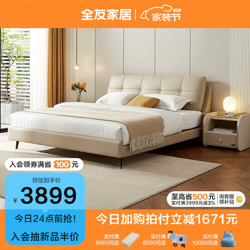 全友家居 真皮艺双人床1.8x2米现代简约主卧室头层牛皮软包大床105135价格:5570.00元!