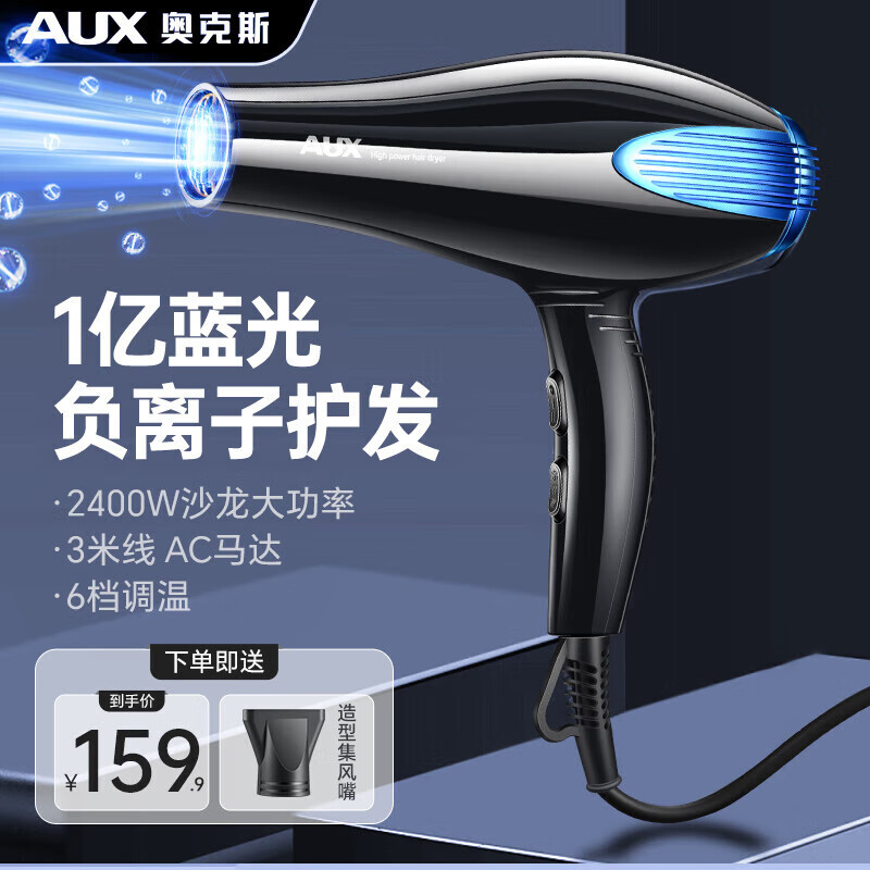奥克斯(AUX)吹风机护发家用蓝光负离子2400W大功率不伤发吹风筒电风吹电风筒吹头发理发店专用发廊专用 7619价格:169.90元!