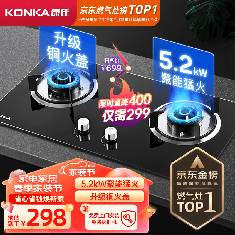 康佳(KONKA)燃气灶双灶家用天然气 5.2kW猛火灶具 台式嵌入式 钢化玻璃大火力灶台 JZT-B500Y(天然气)价格:298.00元!