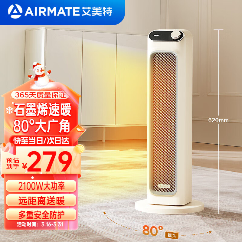 艾美特(AIRMATE)取暖器暖风机家用塔式立式摇头电暖器速热风机电暖气暖风扇卧室办公室小太阳烤火炉节能暖脚神器 奶咖系列-石墨烯+PTC升级款-HP21-K36价格:289.00元!