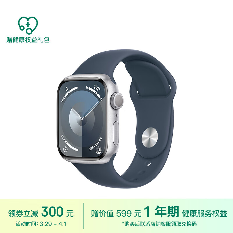 Apple/苹果 Watch Series 9 智能手表GPS款41毫米银色铝金属表壳 风暴蓝色运动型表带S/M MR903CH/A价格:2999.00元!