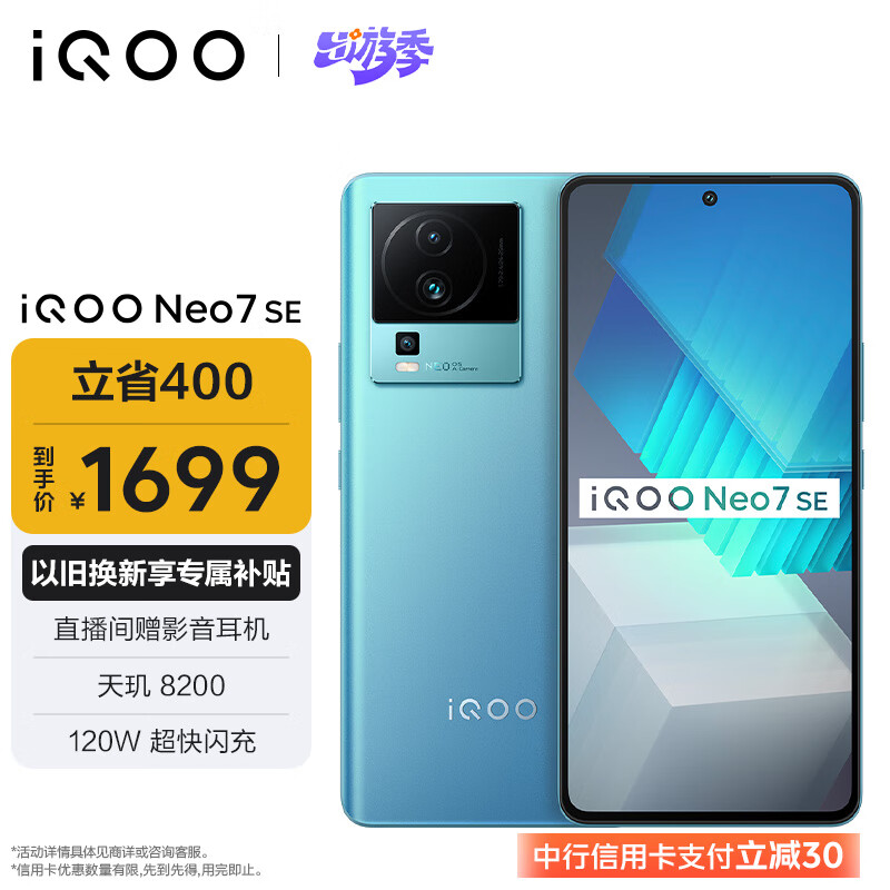 vivo iQOO Neo7 SE 12GB+512GB 电子蓝 天玑8200 120W超快闪充 120Hz柔性直屏 5G游戏电竞性能手机价格:2099.00元!