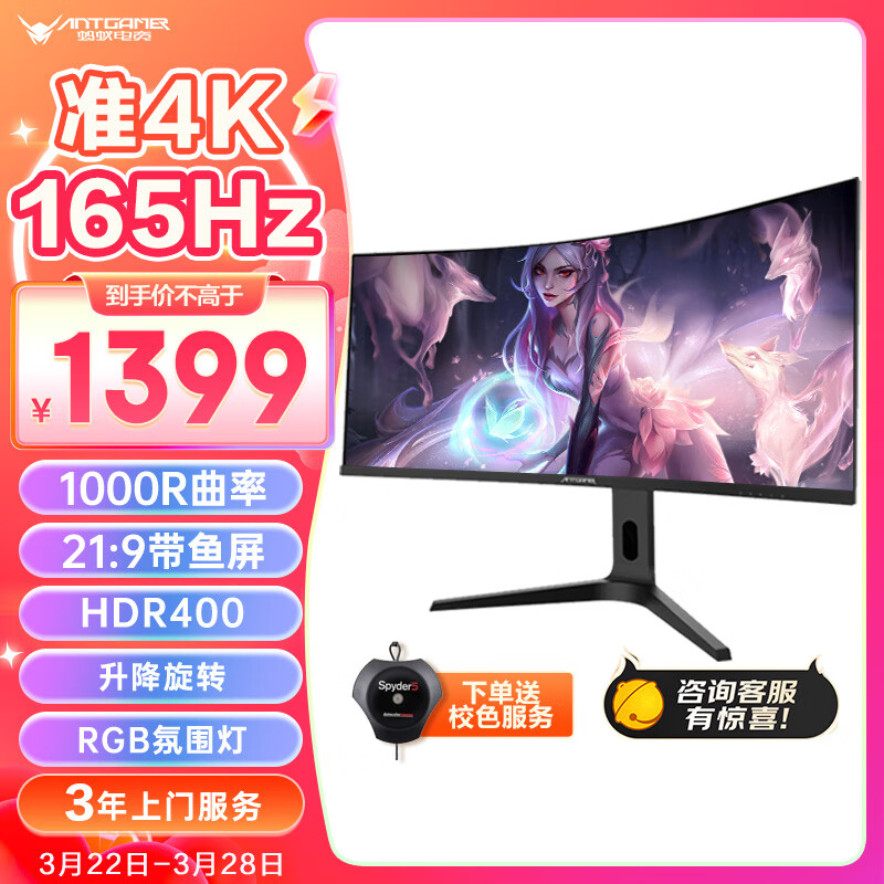 ANTGAMER蚂蚁电竞34英寸带鱼屏准4K 165Hz 1ms HDR400 1000R曲率升降旋转游戏电竞显示器ANT34TUCPro价格:1499.00元!