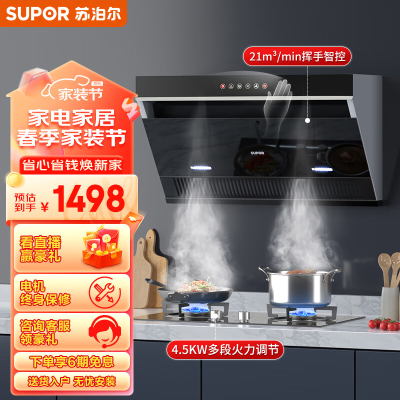 苏泊尔(SUPOR) 抽油烟机 侧吸式烟机灶具套装21立方 家用吸油烟机4.5kW爆炒燃气灶烟灶套装C5+DB19天价格:1598.00元!