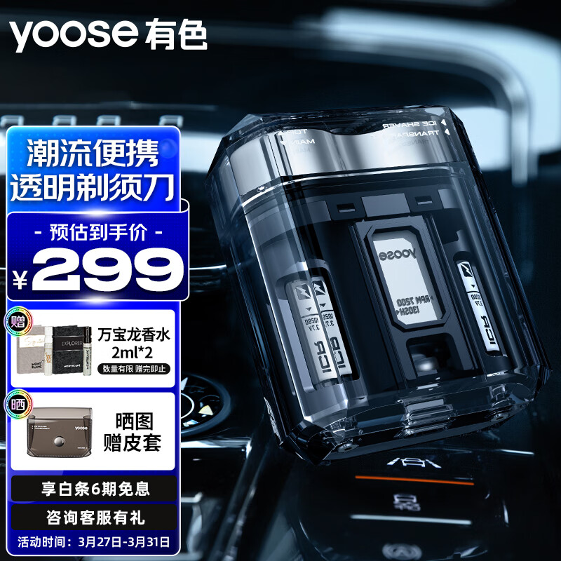 有色(yoose)电动剃须刀 潮流便携 男士刮胡刀 透明机身 生日情人节礼物送男友 胡须刀礼盒 ICE 透明灰价格:399.00元!