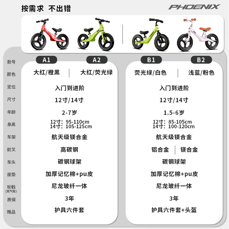 凤凰(Phoenix)儿童平衡车2-6-8岁无脚踏镁合金滑步车滑行溜溜车童车14寸白色价格:359.00元!