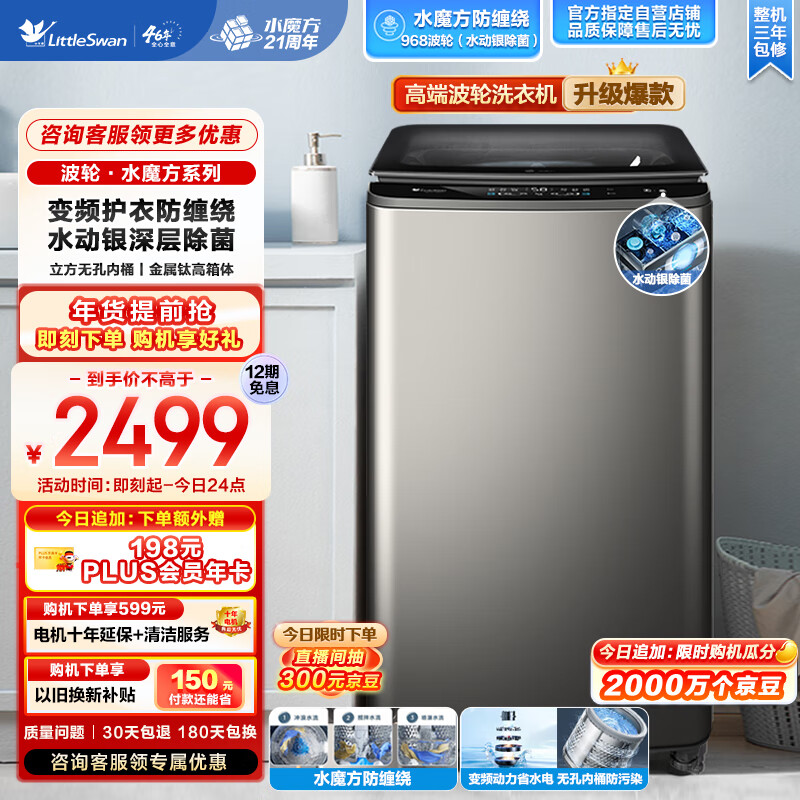 小天鹅(LittleSwan)波轮洗衣机全自动 【水魔方系列】 护衣防缠绕 水动银除菌 直驱变频 10公斤 TB100V968MDT价格:2499.00元!
