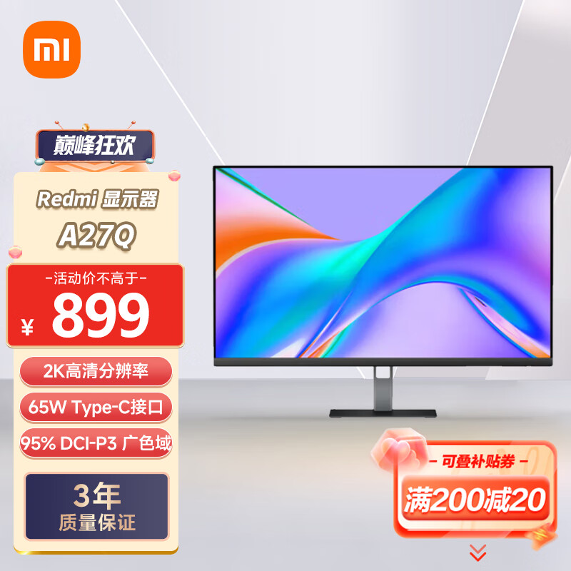 小米Redmi 27英寸2K显示器 A27Q IPS技术 Type-C反向充电 低蓝光爱眼 三微边设计电脑办公显示器价格:899.00元!