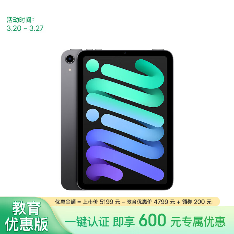 Apple/苹果【教育优惠】iPadmini 8.3英寸平板电脑 2021款(256GB WLAN版/MK7T3CH/A)深空灰色价格:4799.00元!