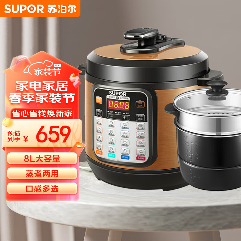 苏泊尔(SUPOR)智能电锅8L 大容量 多功能蒸煮焖炖 上蒸下煮 一键排压 CYSB80YC10C-120 家用高压锅价格:659.00元!