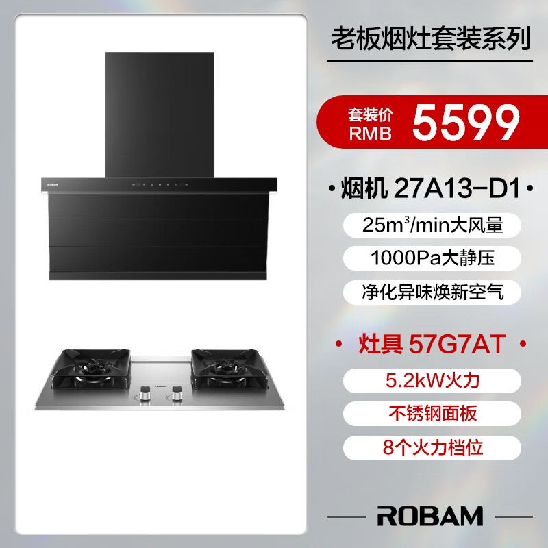 老板(Robam)油烟机家用小黑翼顶侧双吸抽油烟机大吸力25风量七字型排油烟机侧顶吸油烟机不锈钢超薄D1+57G7AT价格:5599.00元!