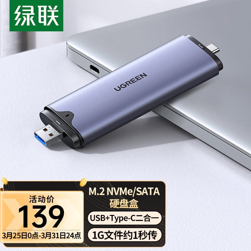 绿联 M.2 NVMe/SATA双协议固态硬盘盒 Type-C/USB3.2移动硬盘盒 适用笔记本苹果15外接SSD机械硬盘价格:159.00元!