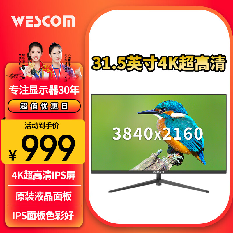 WESCOM 31.5英寸4K 超高清 IPS屏广视角高色域 10.7亿色 10bit 防撕裂不闪屏 制图影音显示器C3273IUY价格:1099.00元!