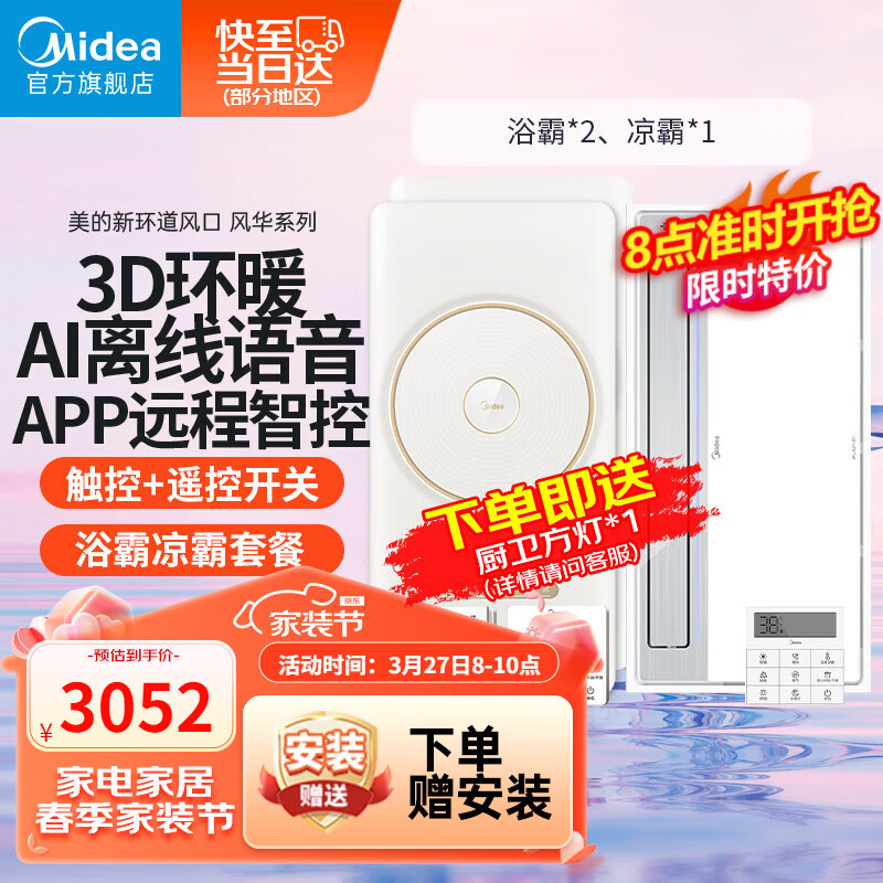 美的(Midea)浴霸风暖集卫生间成吊顶暖风机浴室智能环形双电机语音双控取暖器价格:3052.00元!