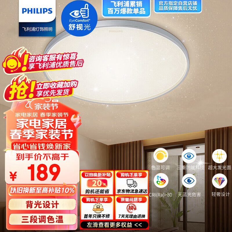 飞利浦(PHILIPS)LED调光卧室灯吸顶灯客厅灯餐厅灯圆形现代简约灯具 星环24W银色价格:249.00元!