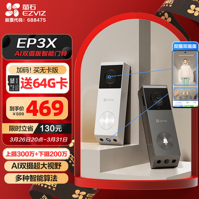 萤石EP3X可视门铃双摄 300万像素+200万像素 双摄像头家用监控 智能门铃摄像机 电子猫眼 灰价格:469.00元!
