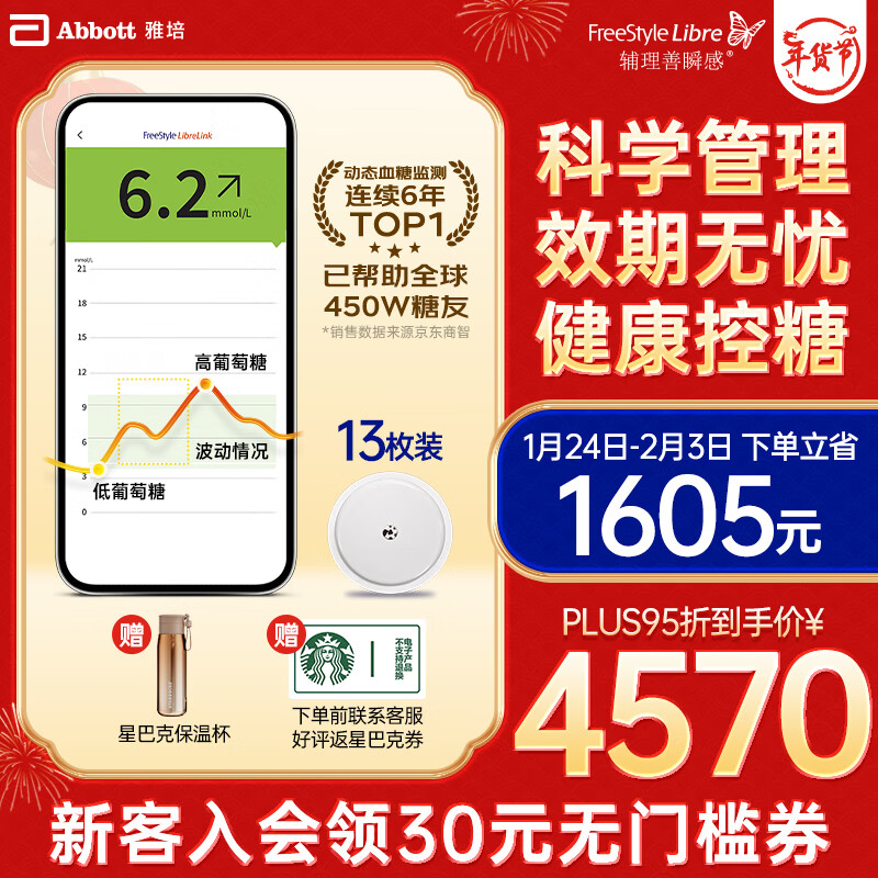 雅培瞬感传感器动态血糖监测仪家用进口血糖仪器免扎针免校准探头*13枚价格:6175.00元!