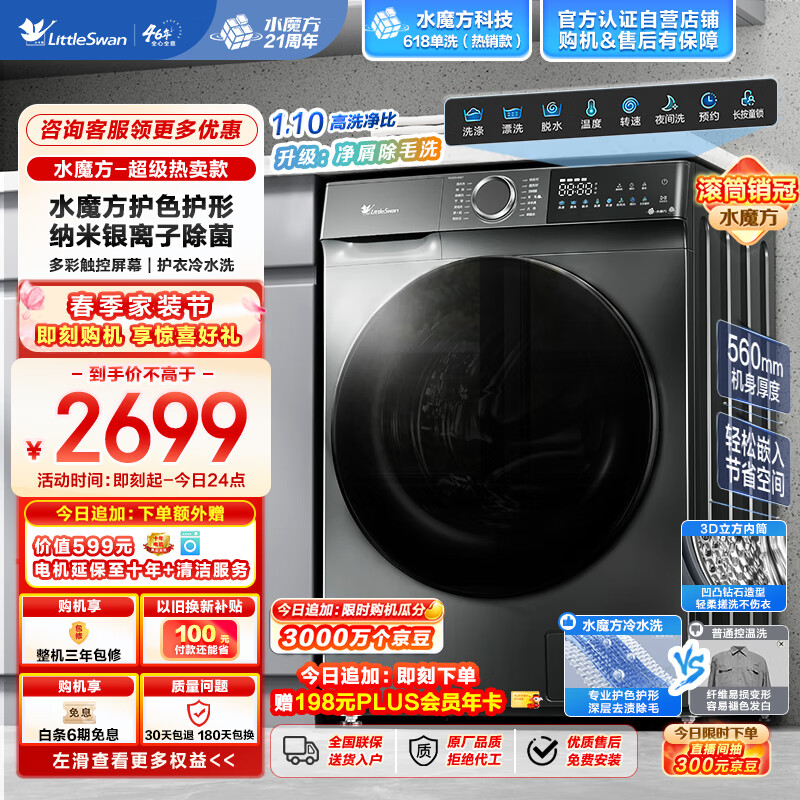 小天鹅(LittleSwan)滚筒洗衣机全自动 10公斤大容量 水魔方 变频智能彩屏 银离子除菌除螨1.1高洗净比 TG100V618T价格:2899.00元!