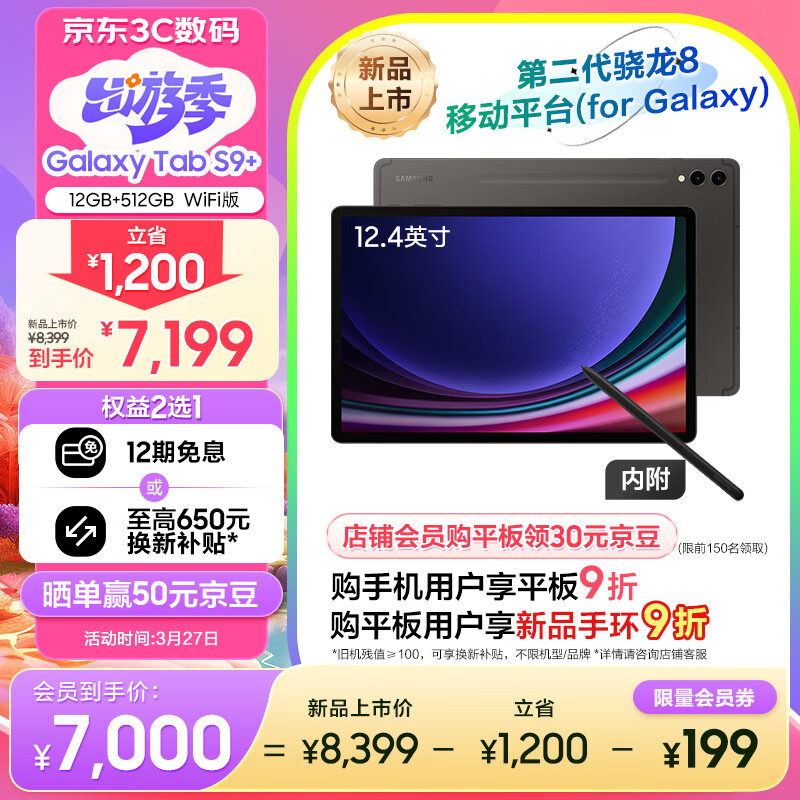 三星(SAMSUNG)S9+ 2023款平板电脑12.4英寸骁龙8Gen2 120Hz 12G+512GB WIFI版学习含触控笔云影灰价格:7199.00元!