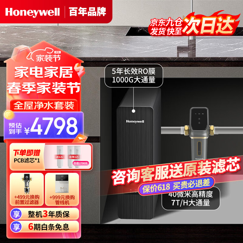 霍尼韦尔(Honeywell)贝加尔系列全屋净水器套装家用厨房直饮净水机RO反渗透纯水机1000G大通量+全自动前置过滤器价格:4798.00元!