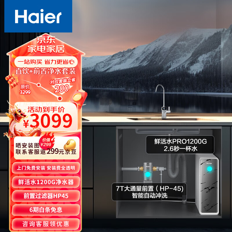 海尔(Haier)净水器1200G鲜活水pro6年RO反渗透厨下直饮3.48L/分钟净水器+前置过滤器HKC3000-R793D2U1+HP45价格:3099.00元!
