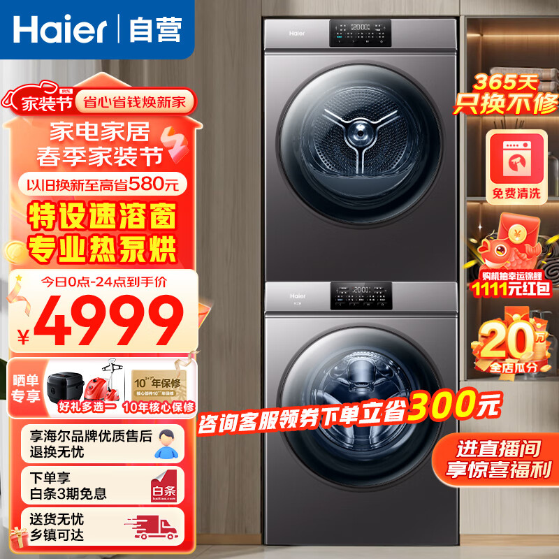 海尔(Haier)06洗烘套装10公斤速溶窗除菌螨洗衣机+10公斤除菌螨4层过滤滚筒式热泵烘干机价格:4999.00元!