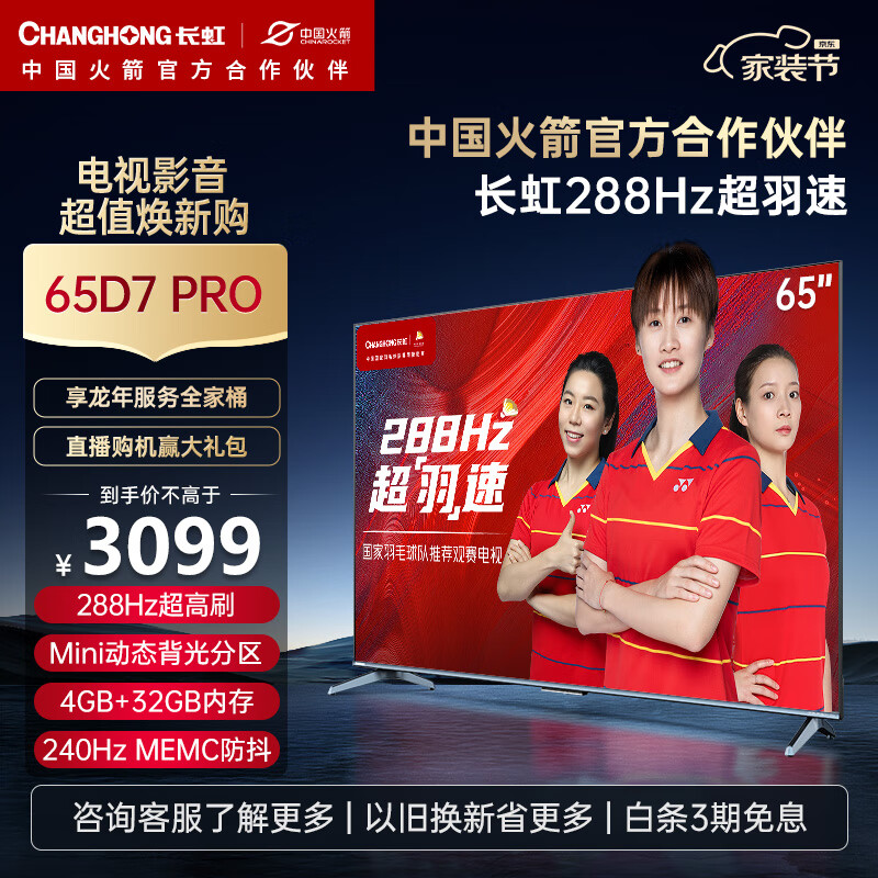 长虹电视65D7 PRO 65英寸288Hz游戏电视 Mini动态背光杜比音画 MEMC 4K智能平板液晶LED电视机以旧换新价格:3099.00元!
