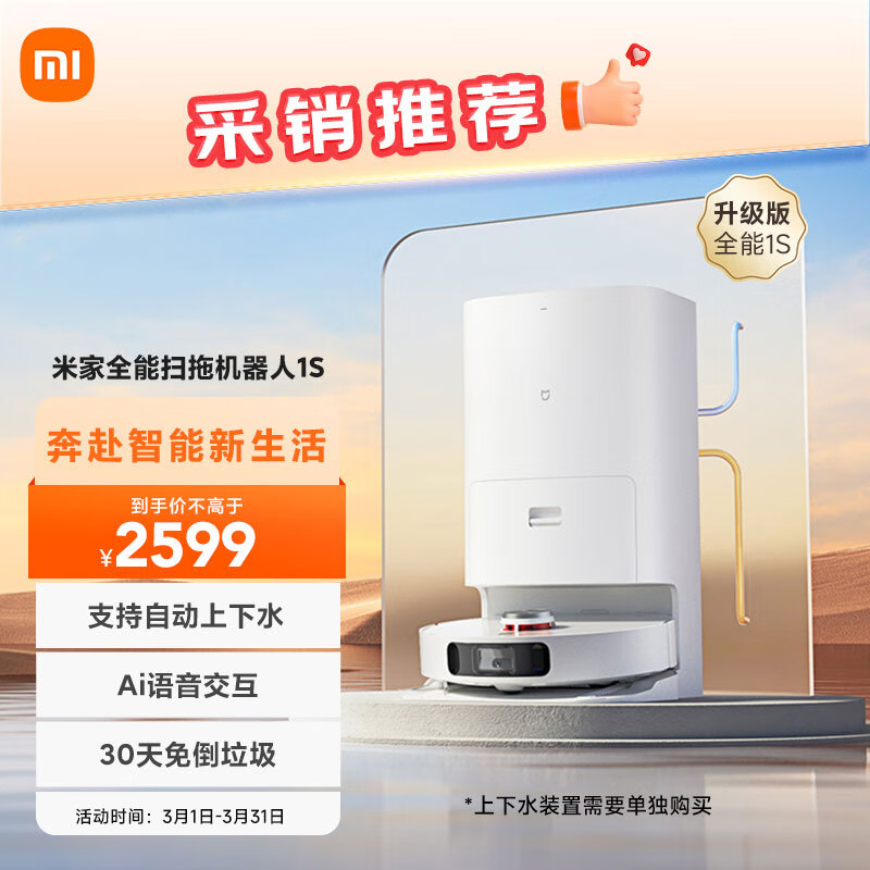 米家 小米全能扫拖机器人1s 扫地机器人扫拖一体 扫拖洗烘一体 自动清洗自动集尘自动上下水 洗地机价格:2599.00元!