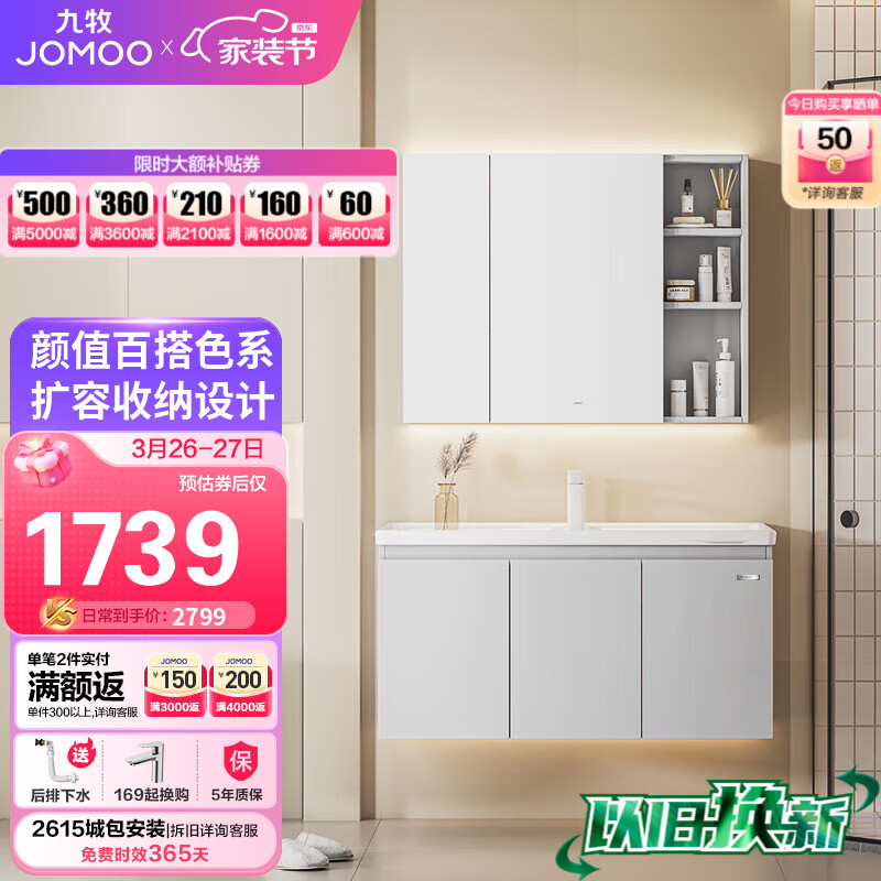 九牧(JOMOO)极简浴室柜陶瓷一体盆悬挂式洗脸洗手组合柜100cm A2721-17LD-1价格:2229.00元!