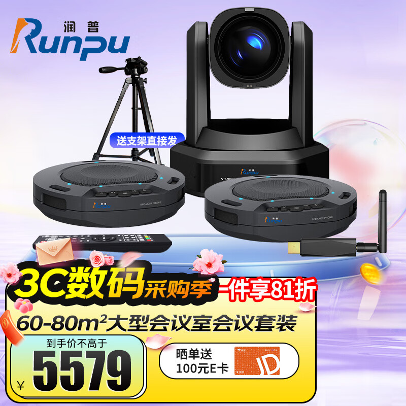 润普Runpu大型视频会议室解决方案适用(12倍AI跟踪会议摄像头多接口摄像机+无线级联全向会议麦)RP-W60价格:6880.00元!