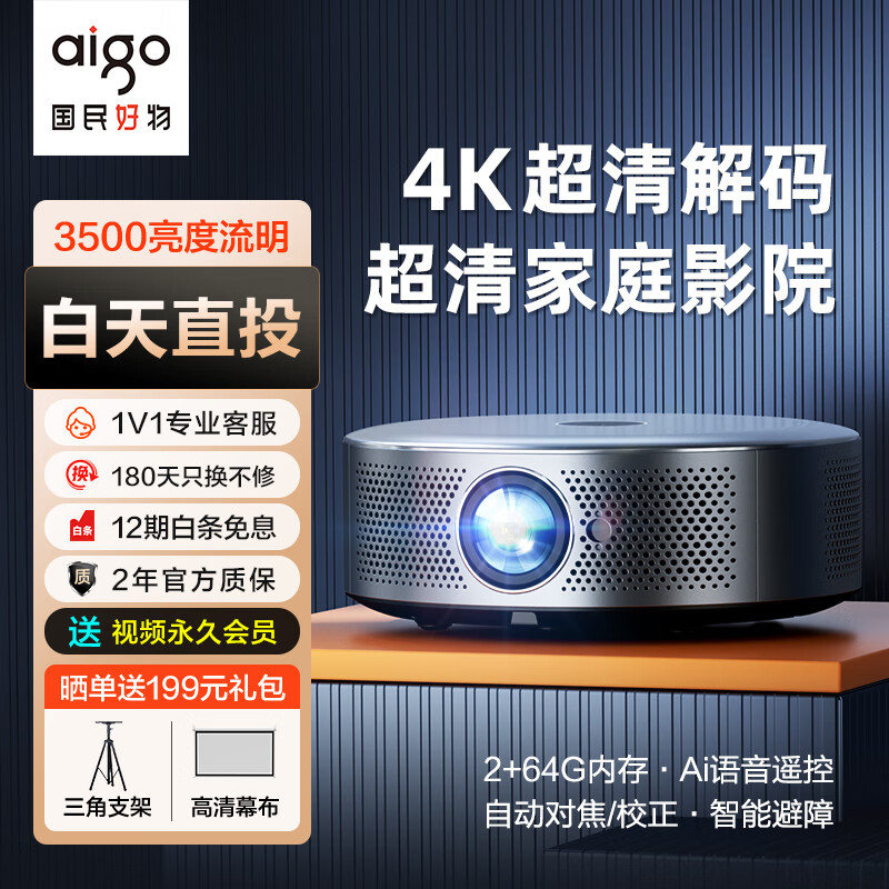 爱国者H62 投影仪家用 便携办公投影机智能家庭影院(3500亮度流明 白天投墙 2+64G内存 自动对焦校正)价格:2299.00元!